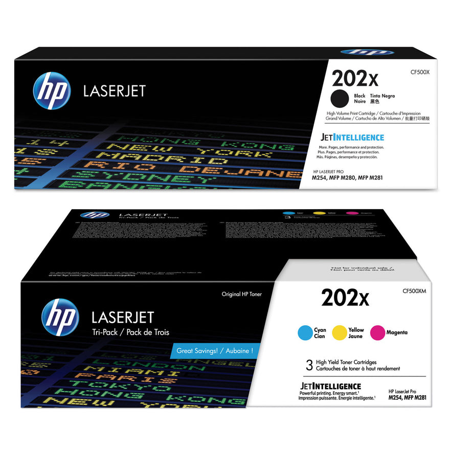 Includes 1 X HP CF500X Black Toner Cartridge, 1 X HP CF500XM Color Toner Cartridge Tri-Pack (Cyan/Magenta/Yellow)
