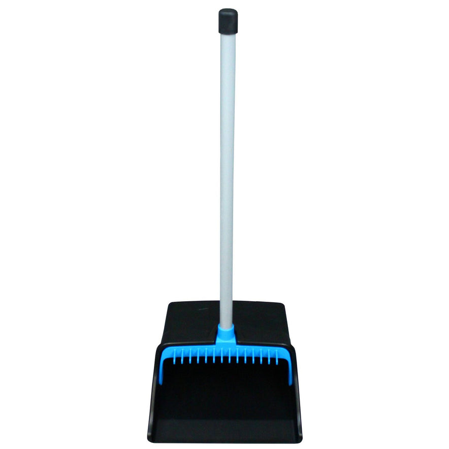 Easy-lock system keeps the handle upright and in place while you sweep. Innovative footrest pads and angled base provide stability. Large pan capacity and tapered front edge simplify dust and debris pick-up. Broom-cleaning teeth on the yoke allow you to clean your bristles as you go. Material(s): Aluminum; Plastic; Width: 11.72"; Handle Length: 31"; Color(s): Blue/Black.