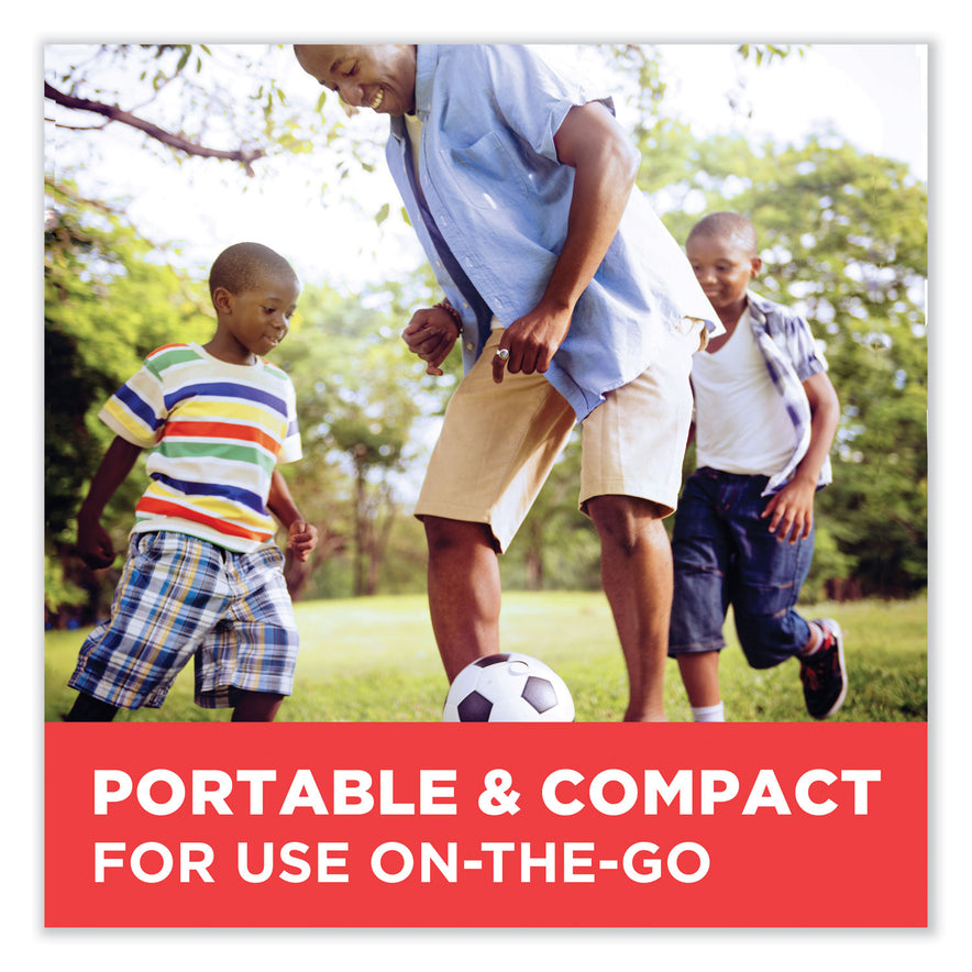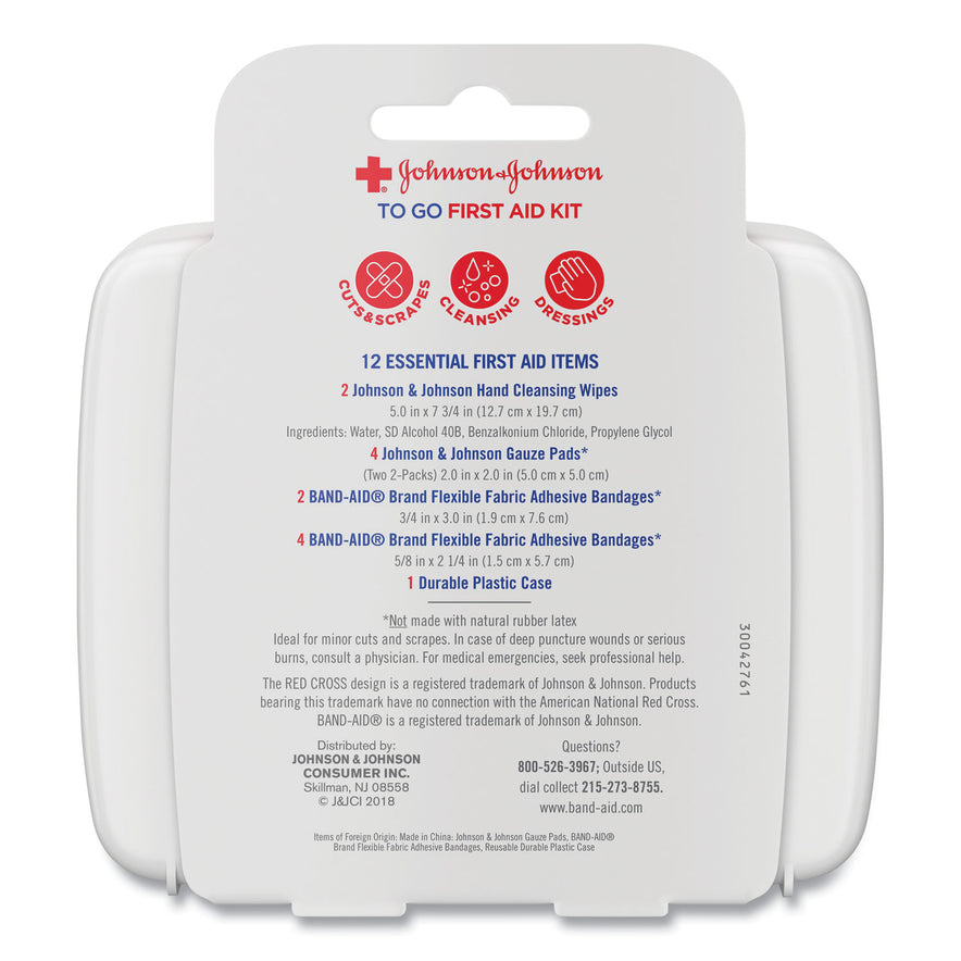 Be prepared while youre on the go with this Johnson & Johnson First Aid to Go! travel emergency first aid kit. Available in a durable plastic case, it contains 12 essential first aid items and wound care supplies and is the perfect mini size to carry in a purse, backpack, gym bag, car or luggage. This portable mini first aid kit contains two 5" x 7.75" Johnson & Johnson Hand Cleansing Wipes, four 2" x 2" Band-Aid Brand Gauze Pads, two 0.75" x 3" Band-Aid Brand Flexible Fabric Adhesive Bandages, and four 0.63" x 2.25" Band-Aid Brand Flexible Fabric Adhesive Bandages. Its ideal for travel, camping trips, vacations, sporting events, or to keep on hand in the car. Number of Pieces: 12; Contains: (2) 5" x 7.75" Johnson & Johnson Hand Cleansing Wipes; (4) 2" x 2" Band-Aid Brand Gauze Pads; (2) 0.75" x 3" Band-Aid Brand Flexible Fabric Adhesive Bandages; (4) 0.63" x 2.25" Band-Aid Brand Flexible Fabric Adhesive Bandages; Case Material: Plastic; Width: 4.5".