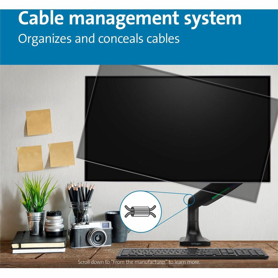 The SmartFit® One-Touch Height Adjustable Single Monitor Arm makes it easy to find the proper monitor height (and a neutral, comfortable posture) with its patented SmartFit® System and fully articulating design. Tested to meet ANSI/BIFMA standards, a heavy duty build guarantees stability in every position while its gas spring monitor mount makes adjusting your monitor's height, depth, and angle effortless -from landscape to portrait mode. The product's built-in Cable Management System organizes and conceals cables while the arm lifts your external monitor up and out of the way, decluttering and clearing valuable desk space at once. Kensington Durability guarantees a more ergonomic workspace for years to come.
