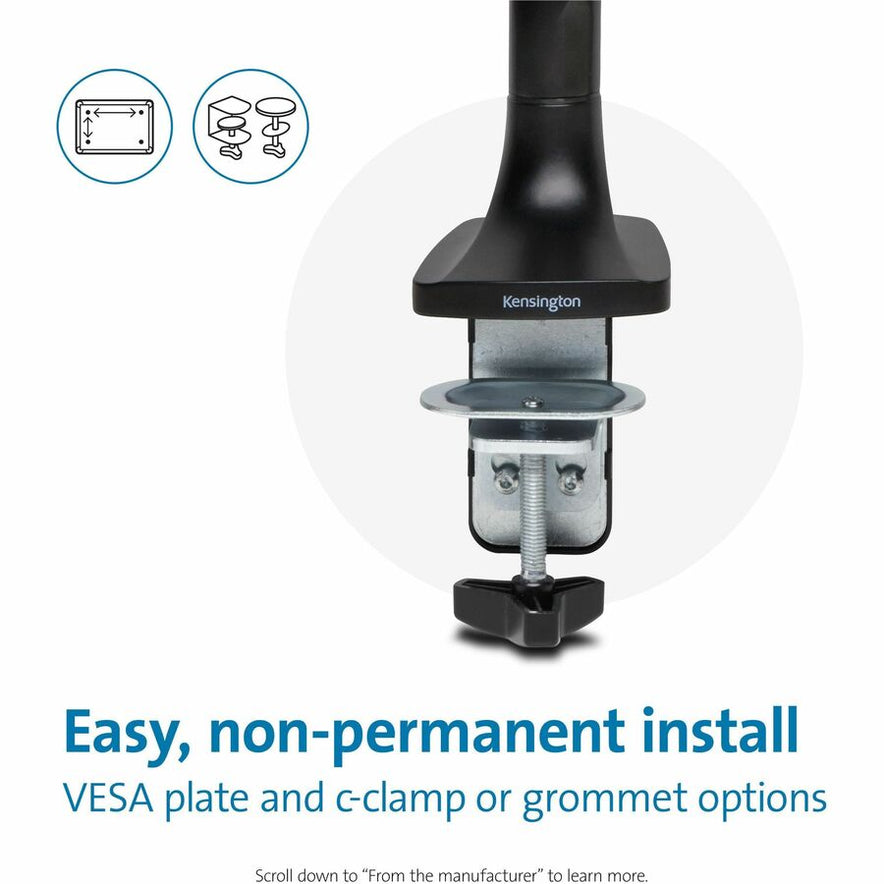 SmartFit® System With SmartFit®, finding the right height for maximum comfort is as easy as 1-2-3. Simply match your hand size to the color on the provided chart, set the height to your color, and you're done. One-Touch Adjustable Arm with Built-in Gas Spring and Counterbalance Tension Adjustment Enjoy effortless adjustment of your external monitor's height, depth, and angle with a fully articulating monitor arm. With 6.7??-19.9?? (170mm-505mm) height adjustment, +/-90° swivel and monitor rotation, and +/-90° tilt adjustment, the One-Touch gas spring monitor mount gives you total control over the placement of your external monitor, from landscape to portrait mode. Its Counterbalance Tension Adjustment allows you to "tighten" or "loosen" the arm to accommodate a range of monitor weights with the same effortlessness and stability (Allen wrench included). Heavy Duty, Stability Focused Design The Kensington SmartFit® One-Touch Height Adjustable Single Monitor Arm is stable in every position, supporting a 13??-34?? flat or curved monitor weighing up to 19.8lbs (9kg). Easy, Non-permanent Installation Mountable by c-clamp (desktop thickness range: 0.39??-3.3?? or 10mm-85mm) or grommet hole (desktop thickness range: 0.9"-3.1" or 10mm-80mm; diameter range: 0.41??-1.97?? or 10.5mm-50mm), installation is non-permanent and non-marking, making removal easy -tool kit included. An included quick-release, detachable VESA plate (75mm or 100 mm) makes the fully articulating arm ideal for VESA mountable monitors. Cable Management System Organizes and conceals cables while the arm lifts your external monitor up and out of the way, decluttering cables and clearing valuable desk space at once. Kensington Durability The Kensington SmartFit® One-Touch Height Adjustable Single Monitor is tested to meet ANSI/BIFMA performance and safety standards. Trust in the dependability of a heavy duty monitor arm and enjoy stability and effortless adjustment for years to come.The SmartFit® One-Touch Height Adjustable Single Monitor Arm makes it easy to find the proper monitor height (and a neutral, comfortable posture) with its patented SmartFit® System and fully articulating design. Tested to meet ANSI/BIFMA standards, a heavy duty build guarantees stability in every position while its gas spring monitor mount makes adjusting your monitor's height, depth, and angle effortless -from landscape to portrait mode. The product's built-in Cable Management System organizes and conceals cables while the arm lifts your external monitor up and out of the way, decluttering and clearing valuable desk space at once. Kensington Durability guarantees a more ergonomic workspace for years to come. With SmartFit®, finding the proper monitor height for maximum comfort as easy as 1-2-3. Simply match your hand size to the color on the provided chart, set the height to your color, and you're done. The Kensington SmartFit® One-Touch Height Adjustable Single Monitor Arm makes adjusting your external monitor's height, depth, and angle effortless. With 6.7??-19.9?? (170 mm-505 mm) height adjustment, +/-90° swivel and monitor rotation, and +/-90° tilt adjustment, the product's fully articulating design gives you total control over the placement of your monitor, from landscape to portrait mode. Its Counterbalance Tension Adjustment allows you to "tighten" or "loosen" the arm to accommodate a range of monitor weights with the same effortlessness and stability (Allen wrench included). The Kensington SmartFit® One-Touch Height Adjustable Single Monitor Arm is stable in any position, supporting a 13??-34?? flat or curved monitor weighing up to 19.8 lbs (9 kg). The Kensington SmartFit® One-Touch Height Adjustable