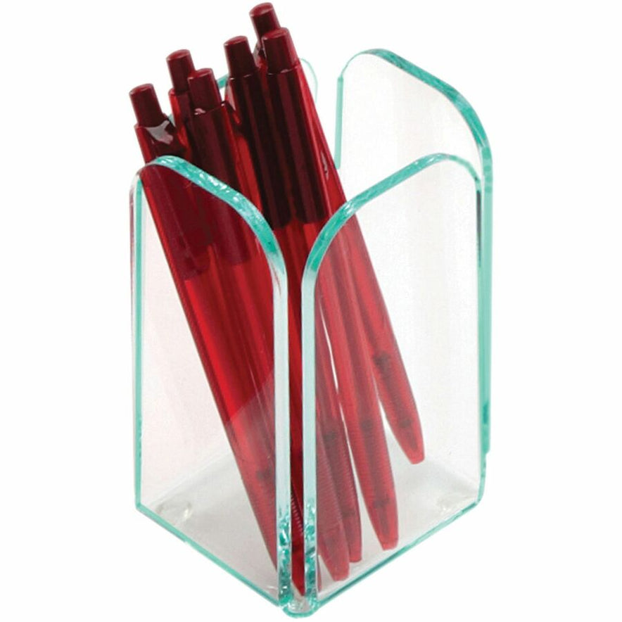 Pencil cup offers a durable, lightweight design with polished edges. Smooth, curved edges feature a hint of green to emulate the look of real glass. Nonskid feet protect desktop surfaces and keep your important papers on your desktop. Pencil cup is 2-1/2" in diameter and made of durable acrylic.
