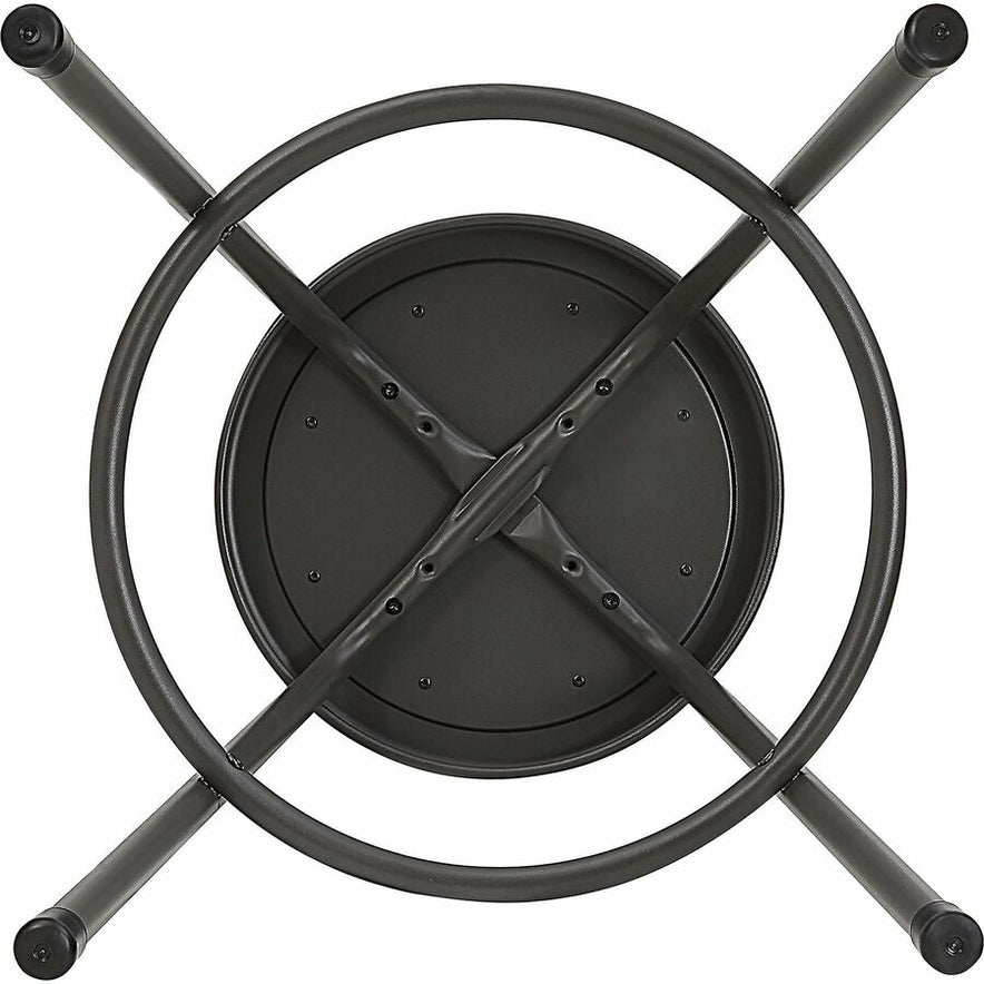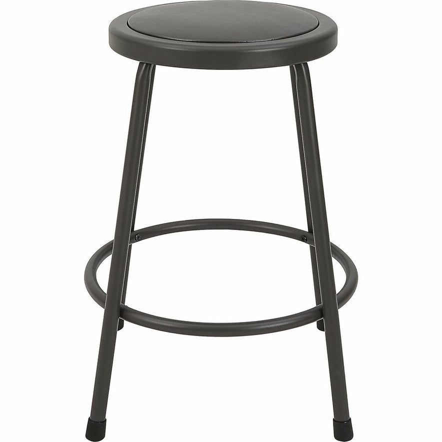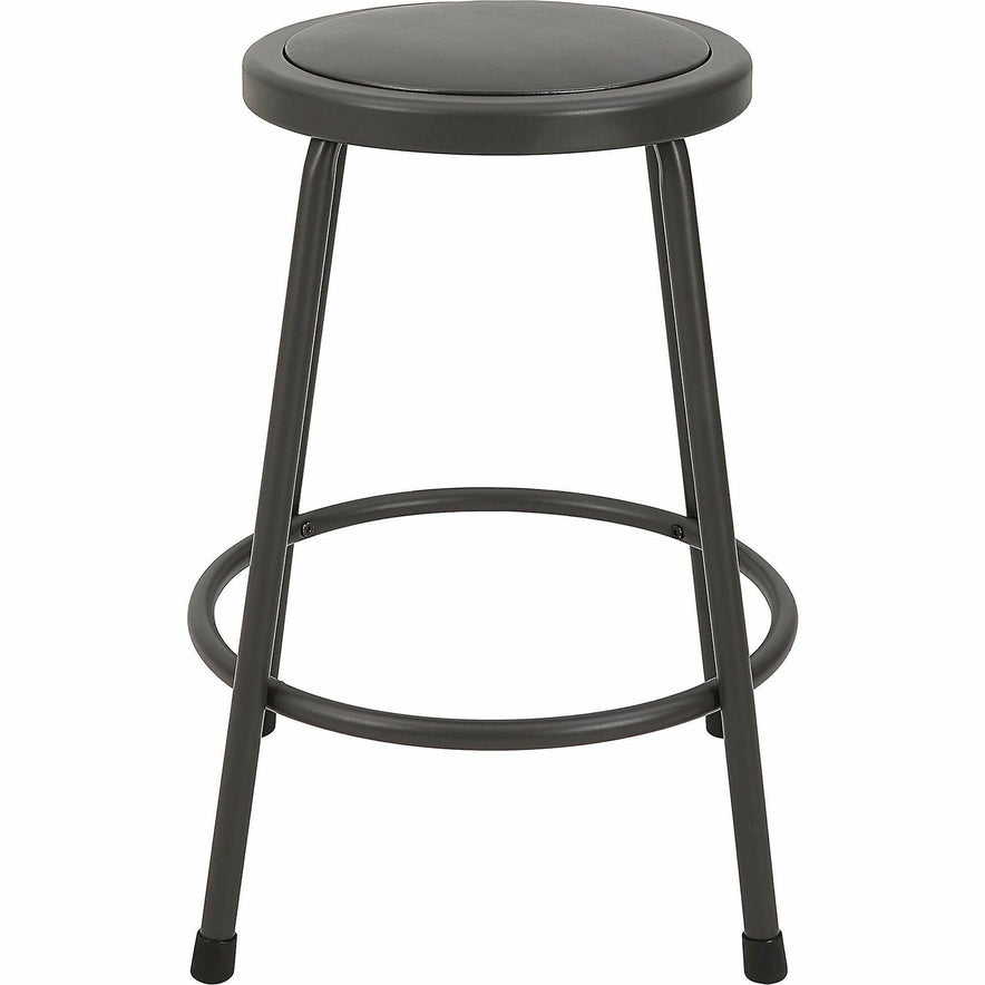 Metal Shop Stool is ideal in the shop, garage, science/art lab, factory floor or anywhere else where durability matters most. It stacks to save space. Backless design offers 360-degree access for easier seating. Riveted to the seat pan at 24" high, the padded vinyl seat stays in place. Built-in foot ring provides a place to rest your feet when seated. Nonmarring floor glides protect your floors when you need to slide it to the next workstation. Weight capacity is 275 lb. Stool meets or exceeds ANSI/BIFMA standards.