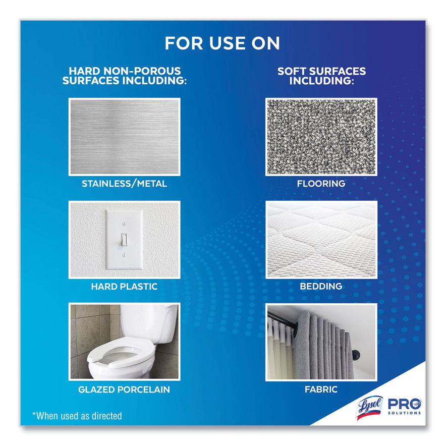 Get maximum versatility with minimal effort with Lysol Disinfectant Spray thats safe to use on hard and soft surfaces. Lysol kills 99.9% of viruses and bacteria, including the virus that causes COVID-19 in 15 seconds, as well as cold and flu viruses when used as directed. Help protect high-traffic areas and high-touch surfaces, including desks, bathrooms, doorknobs, and railings. Deliver hospital-type disinfection on to soft surfaces, including upholstery, curtains, sofas, mattresses, and cushions. Meet customer and staff expectations around disinfection. Simply spray and let air dry. Application: Disinfectant/Sanitizer; Applicable Material: Ceramics; Enamel; Fiberglass; Laminates; Metal; Plastic; Vinyl; Chemical Compound: Ethanol; Alkyl (50% C14, 40% C12, 10% C16) Dimethyl Benzyl Ammonium Saccharinate; Dirt Types: Bacteria; Fungus; Germs; Mildew; Mold; Viruses.