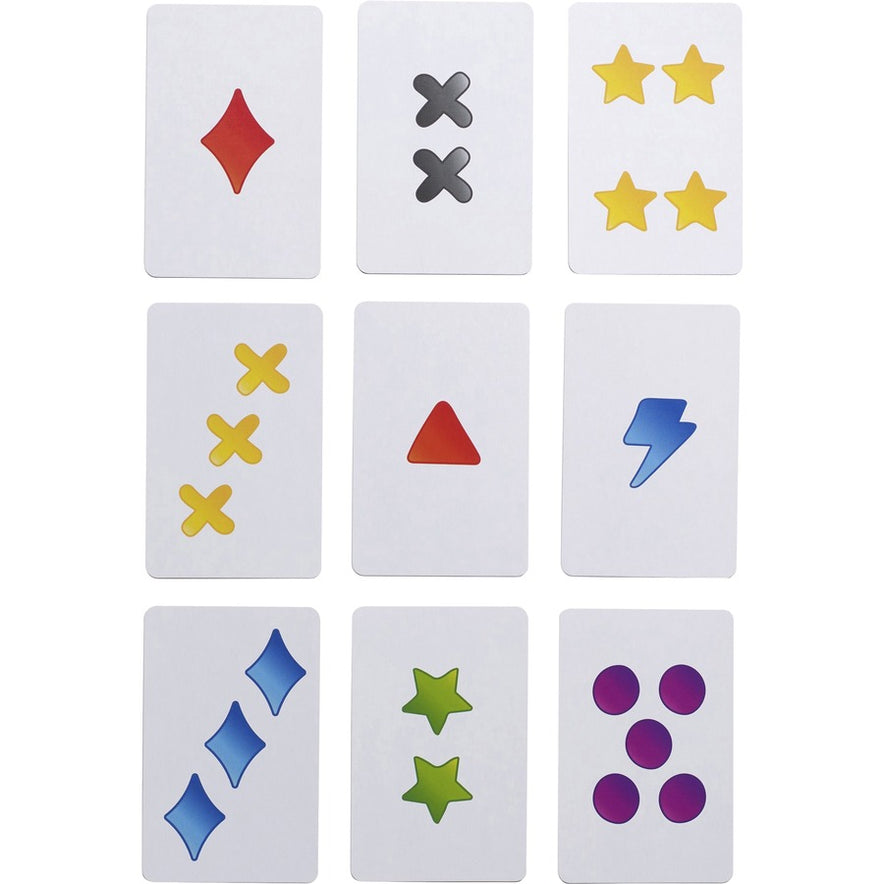 Blink is the lightning-fast game where two players race head-to-head to be the first to play all of their cards. Using sharp eyes and fast hands, players quickly try to match the shape, count or color on the cards. For instance, a card with four yellow stars could be played on any card with yellow (color), or on a card with stars (shape), or on a card with four symbols (count). The first player who can rid themselves of all their cards wins. Fast and portable, this game includes 60 symbol cards and instructions for regular and quick play. Game requires 2 players and is designed for children ages 7 and above.