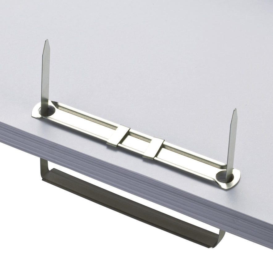 Complete two-piece fastener includes prong base and compressor. Ideal for use in file folders that need to be modified or added to frequently. Locking compressors slide over base prongs to keep papers tightly compressed to save valuable filing and storage space. Both bases and compressors are made of brightly finished, corrosion-resistant tempered steel.