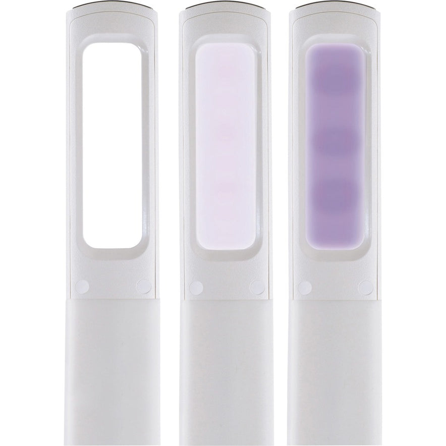 OttLite brings the eyestrain-reducing power of ClearSun LED technology together with the sanitizing power of Visible Light Disinfection to provide the ultimate healthy light. Simply turn on this Thrive LED Desk Lamp with Clock to begin sanitizing your space against potentially harmful bacteria, mold and fungi. Super-flexible silicon neck lets you direct light right where you need it. This flexible lamp adjusts from 10" to 18-3/4" and features an LCD that displays date, time and ambient temperature. Plus, the built-in USB charging port keeps your devices charged. Plastic desk lamp also features chrome accents and textured head and base with stitching detail. Base measures 2.65" x 3.625".
