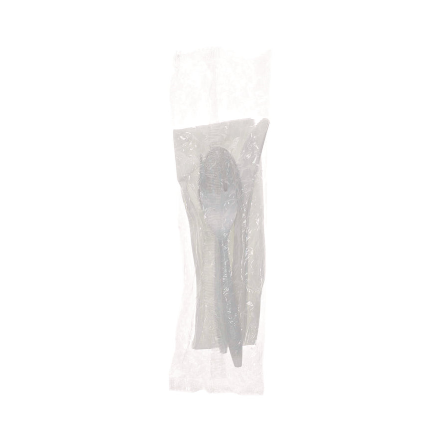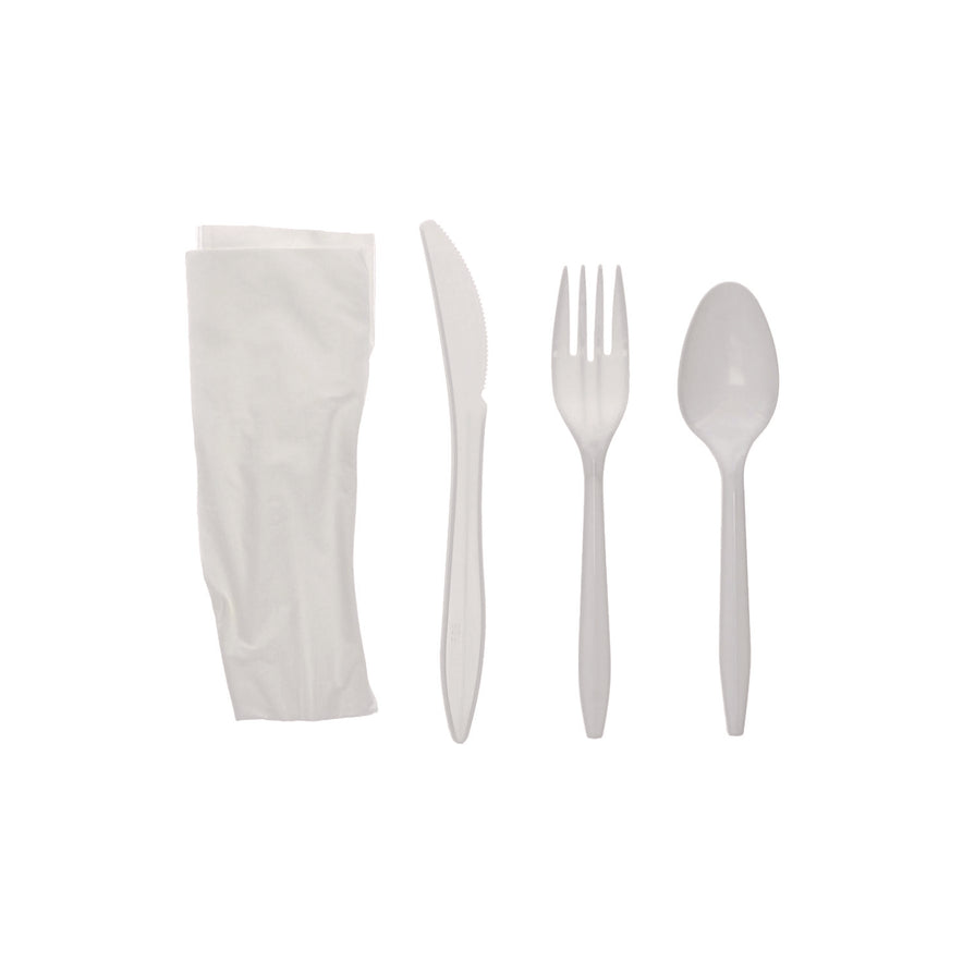 Strong, break-resistant polypropylene construction. Long length and heavier weight for added performance. Handle engineered for improved strength, grip and style. Safe, sanitary option for dine-in or carry-out meals. Individually Wrapped. Utensils Type: Fork; Knife; Teaspoon; Napkin; Material(s): Polypropylene; Color(s): White; Grade: Mediumweight.