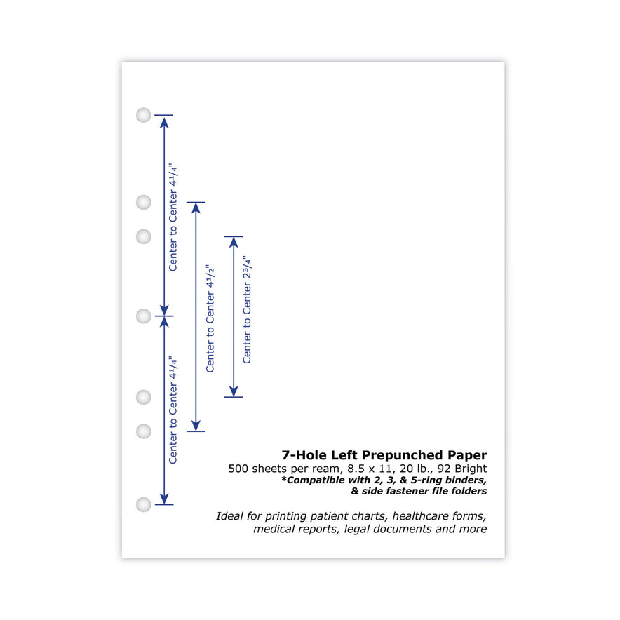 Ideal for a variety of business, medical, legal and education applications. Provides optimum results with any inkjet printer, laser printer or copier. Bright white. Punched PaperFor hospital charts, patient records and medical tests. Sheet/Roll Size: 8.5 x 11; Paper Basis Weight (lb): 20 lb Bond; Paper Grade (gsm): 75; Paper/Media Color(s): White.