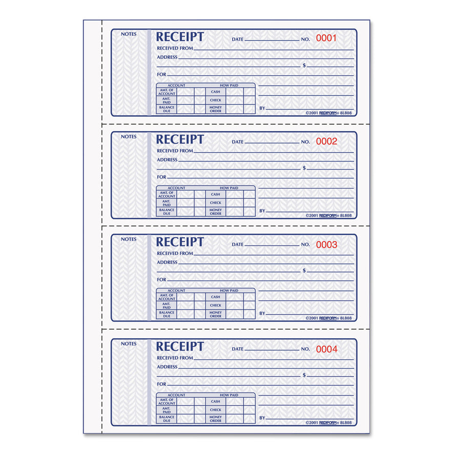 Rediform Money Receipt Book, Softcover, Three-Part Carbonless, 7 x 2.75, 4 Forms/Sheet, 100 Forms Total (8L808)