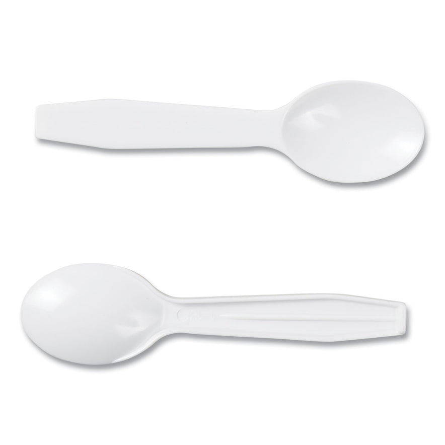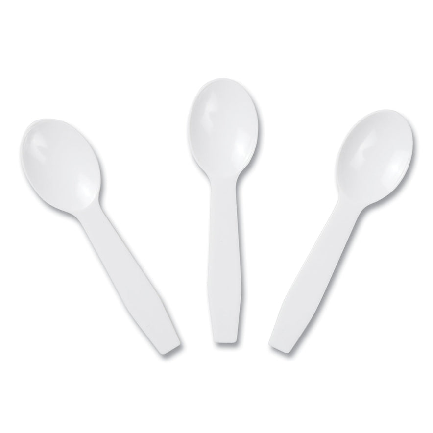 Conveniently lightweight and disposable little plastic spoons are great for ice cream or sampling food. Utensils Type: Spoon; Material(s): Plastic; Color(s): White; Length: 3".
