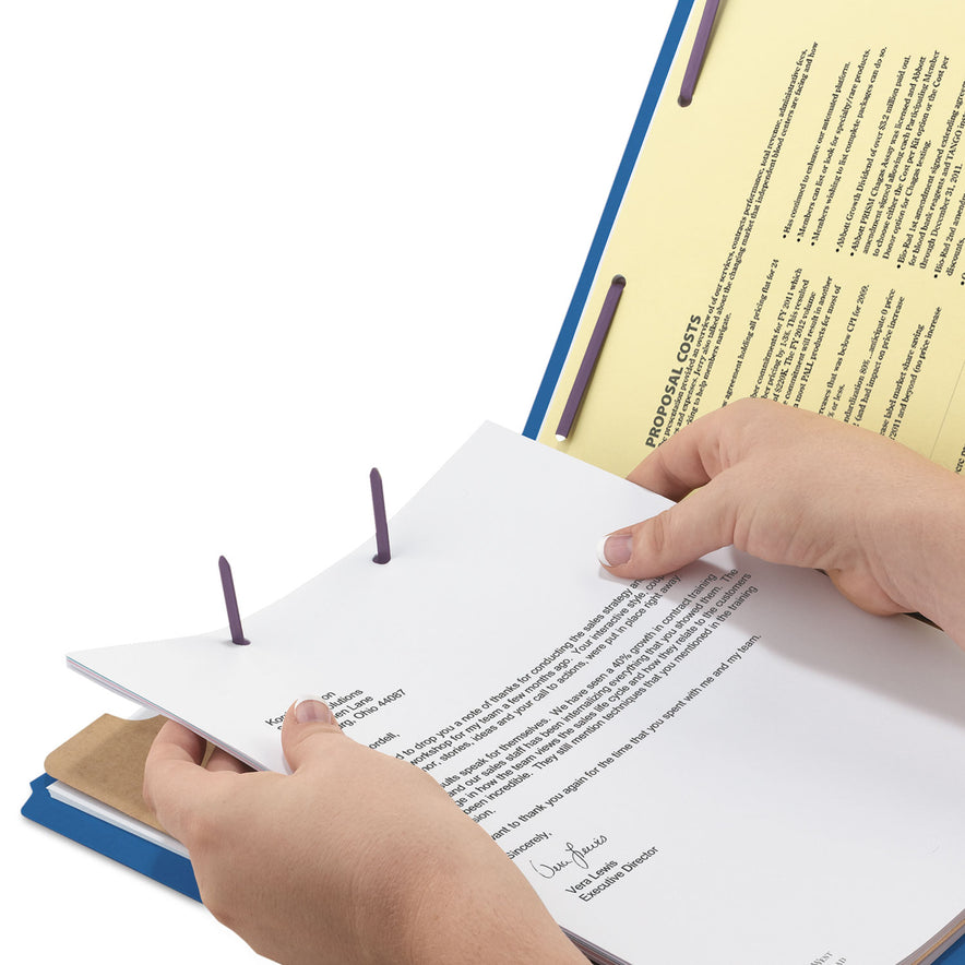Protect your documents and fingers with Smead patented SafeSHIELD Coated Fastener Technology; the ultimate solution to fastener issues, including paper tears, finger cuts and excessive fastener crinkling. Use colors to signal category or type of project at a glance. Sturdy tear resistant gusset expands to hold up to 2" of material. Fasteners on front and back panels and dividers create four separate filing surfaces within one folder. Folder Size: Letter; Total Number of Dividers: 1; Total Number of Fasteners: 4; Max Folder Expansion: 2".