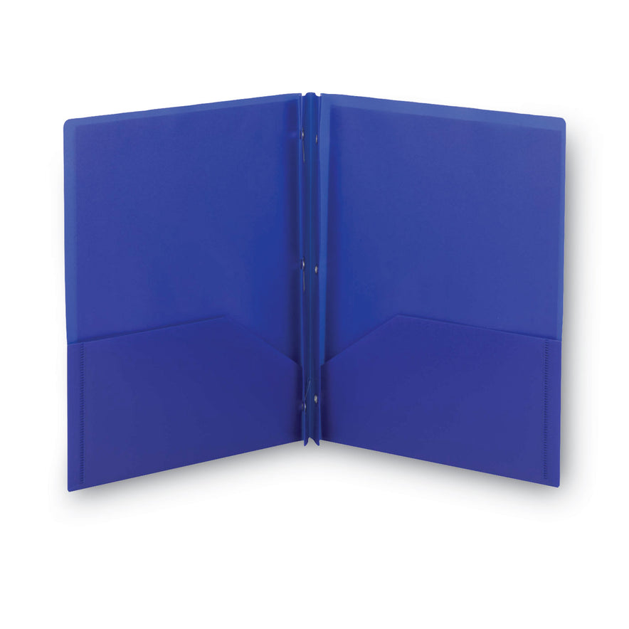 Durable two-pocket folders are perfect for all types of presentations, proposals and projects. They allow for easy storage and transport while keeping the documents organized and easily accessible. The large pockets holds up to 50 sheets each. Metal fasteners hold up to 80 three-hole punched papers. Inside back pocket is die cut to hold a business card. Durable poly material is tear- and water-resistant and easy-to-clean. Acid free and PVC free. Front Cover Color(s): Blue; Color Family: Blue; Back Cover Color(s): Blue; Sheet Size: 11 x 8.5.