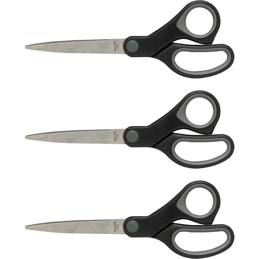 Straight scissors feature a rubberized grip for more comfort and control. Corrosion-resistant, stainless steel blades keep a sharp edge longer. Blades are finely ground for smooth, constant cutting. Scissors are great for everyday use in your home office.