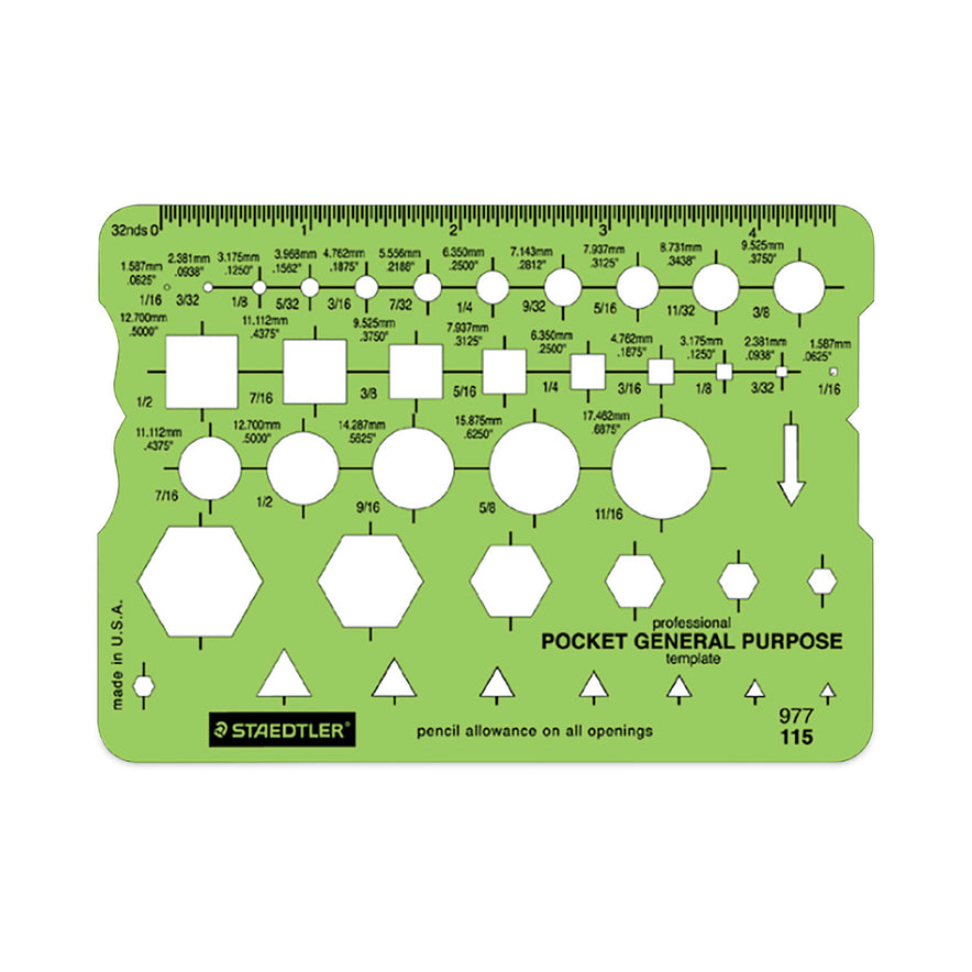 Transparent green plastic is easy to see through and use. Matte finish on one side reduces glare. Cut-out identification and ruler scales are printed in easy-to-read black ink. Designed for use with a 0.5mm pencil lead. Color(s): Green; Material(s): Plastic; Length: 5.13"; Width: 3.63".