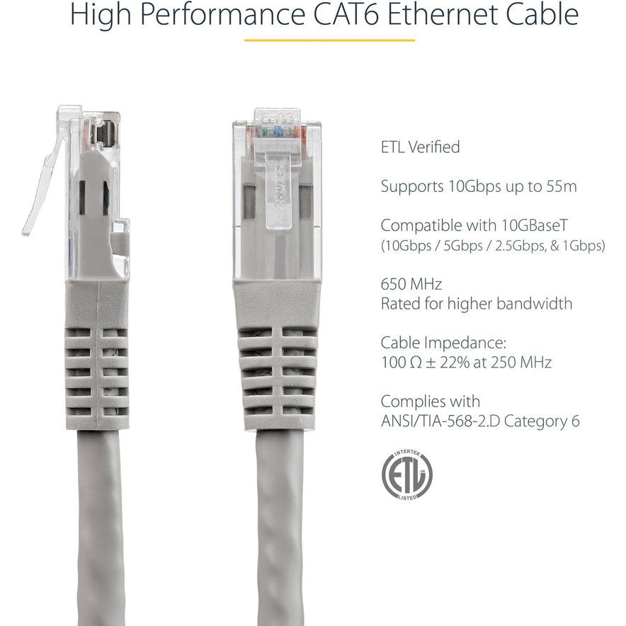 25ft Gray CAT6 Ethernet cable delivers Multi Gigabit 1/2.5/5Gbps & 10Gbps up to 160ft - 650MHz - Fluke tested to ANSI/TIA-568-2.D Category 6 - 24 AWG stranded 100% copper UL Rated wire (E132276-A) - 100W PoE - 25 foot - ETL - Molded UTP patch cord