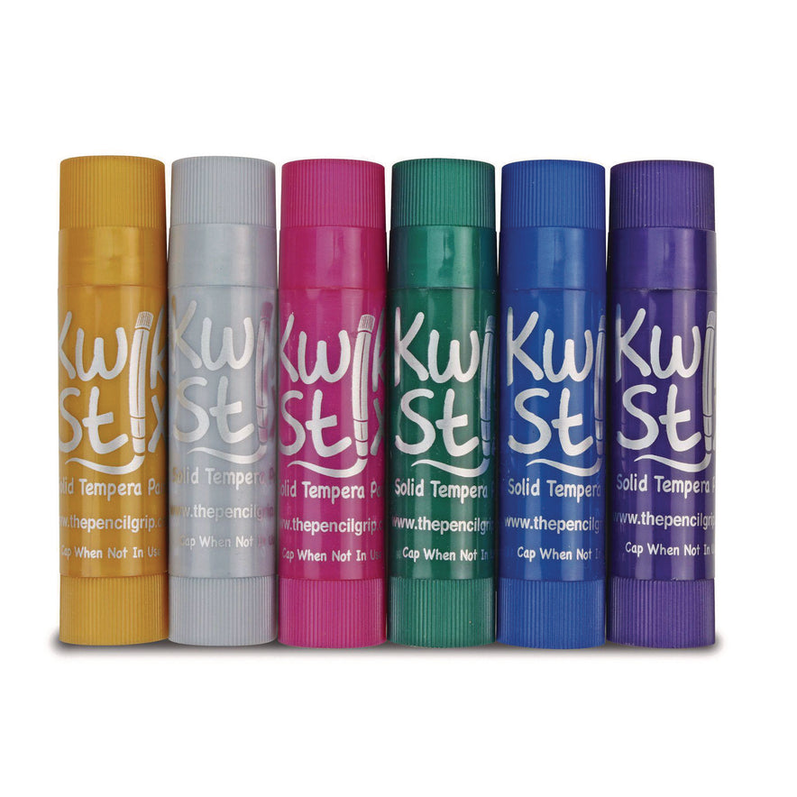 Tired of the endless mess of painting? Fear not! Kwik Stix Solid Tempera Paint sticks take the mess out of painting while keeping all the fun. Simply uncap, twist, and paint. Kwik Stix have a fast drying formula that allow them to dry in 90 seconds while still leaving a paint-like finish. No cups, smocks, water or brushes required. Kwik Stix come in assorted vibrant colors with coverage that won't crack. Great on poster paper, cardboard, wood and canvas. Nut-, egg-, and gluten- free! Non-toxic. Washable. Color(s): Assorted; Color Family: Metallic; Color Assortment: Blue; Green; Gold; Pink; Purple; Silver; Size Group: Standard.