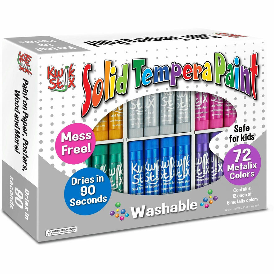 Enjoy mess-free painting with Metalik Kwik Stix. These tempera paint sticks take the mess out of painting while keeping all the fun. Simply uncap, twist and paint. Kwik Stix have a fast-drying formula that allows them to dry in 90 seconds while still leaving a paint-like finish. You won't need cups, smocks, water or brushes. Kwik Stix come in assorted vibrant colors with coverage that won't crack or fade. They work great on poster paper, cardboard, wood and canvas. Metalik Kwik Stix are nut-free, egg-free and gluten-free.