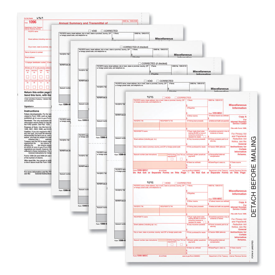 This TOPS forms pack provides 50, 5-part 1099-MISC inkjet/laser sets and three 1096 summary forms.