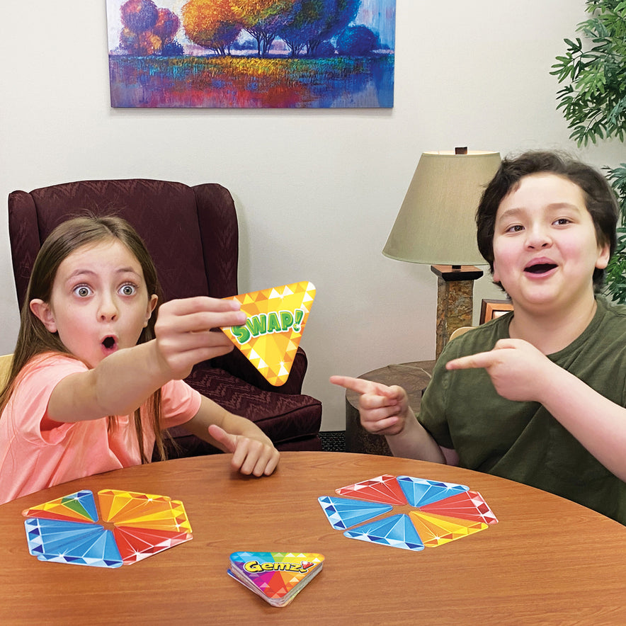Unique three-sided, brilliantly-colored game cards make Gemz a favorite right out of the box. The simple yet surprising game play keeps everyone from preschoolers to adults wanting to deal another round! Luck-of-the-draw and the game-changing SWAP cards make sure that no player can coast to an easy win. Gemz Card Game is a great icebreaker for parties, game nights, and makes an excellent birthday present for kids too. The rules are simple enough for younger children, teens, and adults to all enjoy playing together.