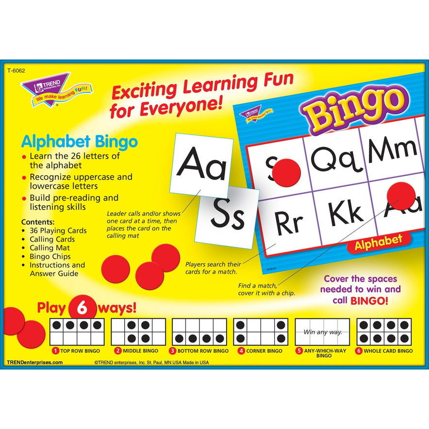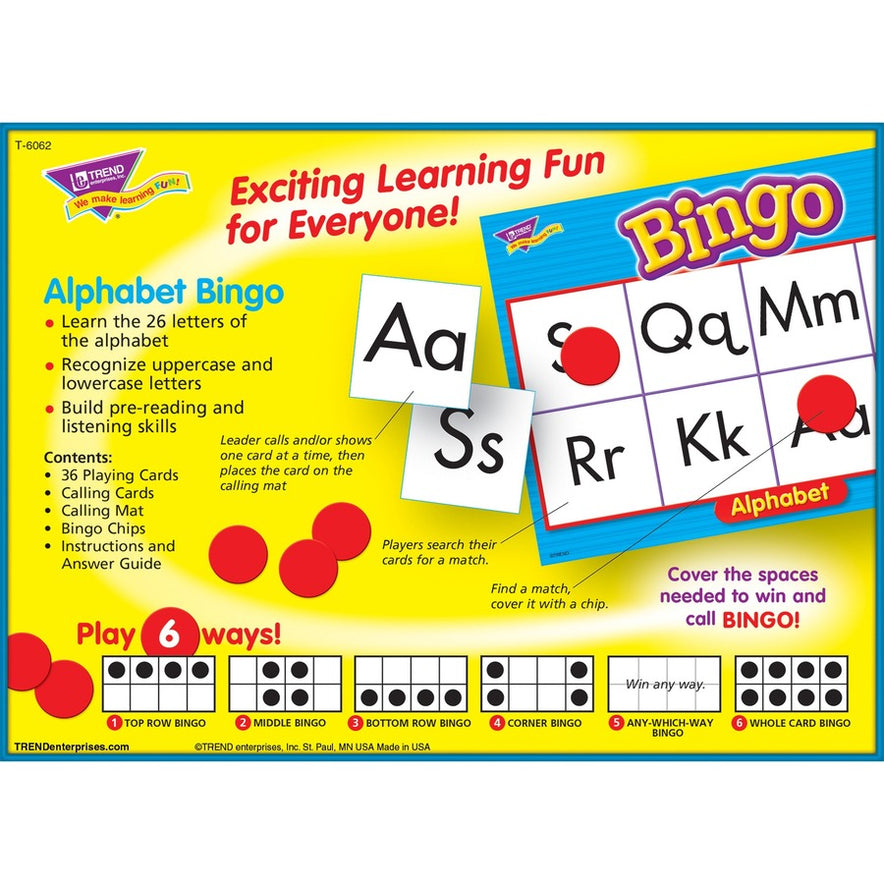 In Alphabet Bingo, players learn to recognize uppercase and lowercase letters by making visual or auditory matches. Unique, six-way format adapts to a variety of skill levels, and is a fun learning supplement for small groups or the entire class. Also ideal for learners with disabilities and anyone learning English. Set includes 36 playing cards, more than 200 chips, caller's mat and cards, and a sturdy storage box. Bingo games are designed for students in prekindergarten to first-grade (ages 4 to 6).