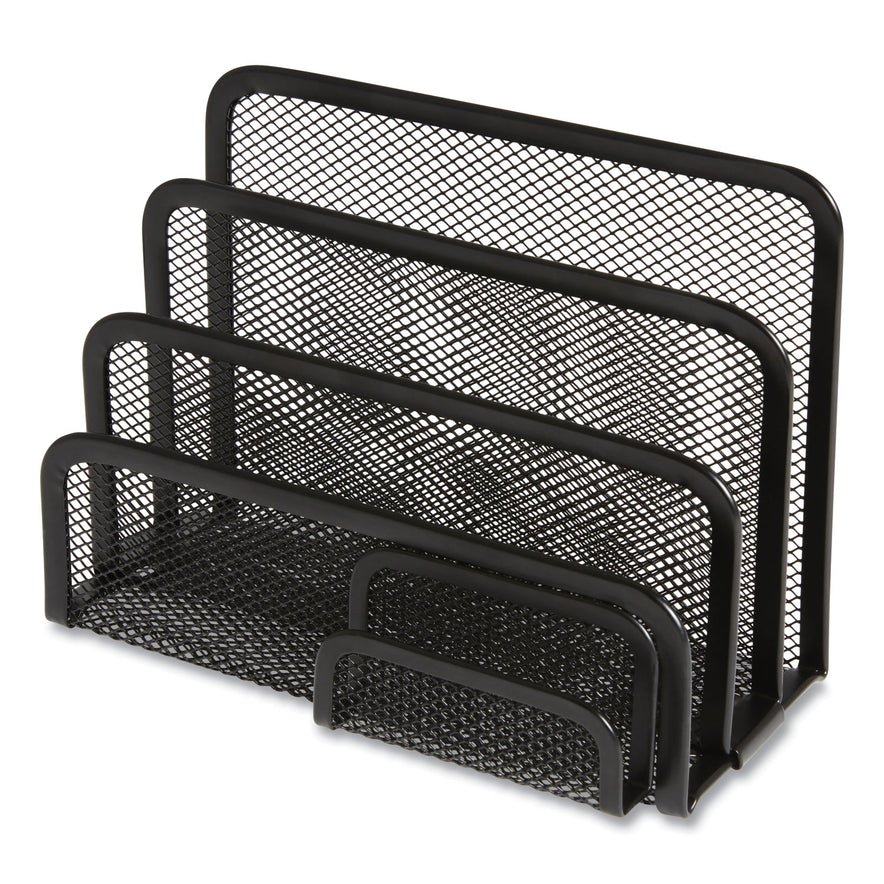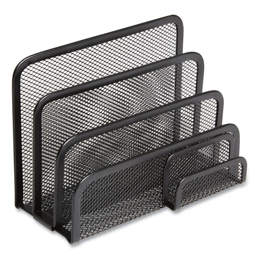 Organize your ingoing and outgoing mail while keeping your business cards within easy reach. Staggered dividers make it easy to keep track of which envelopes go where. Tightly woven metal-mesh body and a sleek, flat-square frame with rounded edges deliver reliable performance with a contemporary, professional flair. Front compartment stores up to 40 standard business cards. Number of Compartments: 4; For File Size: #6 1/4 to #16 Business/Trade Envelopes; Load Orientation: Top; Color(s): Matte Black.