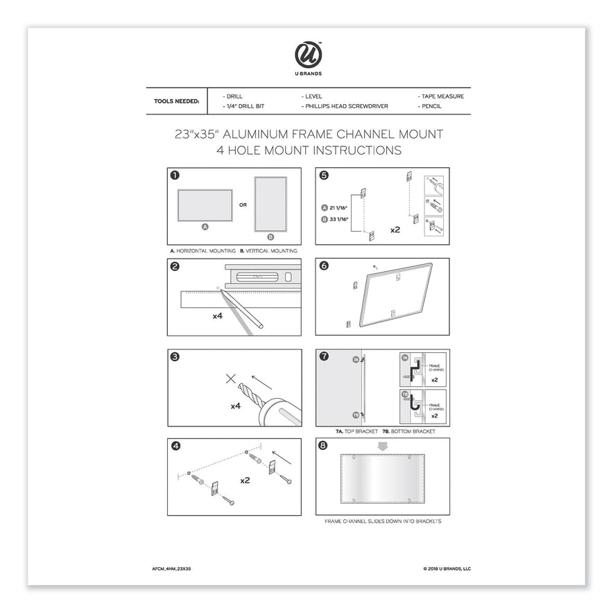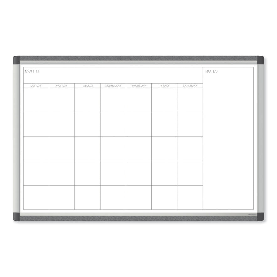 Silver aluminum PINIT frame magnetic dry erase calendar board is a perfect and functional solution for the frequent usage areas of your office, school classroom, home or any commercial space. Although all dry erase markers work well with this board, the U Brands dry erase markers provide the ultimate writing and eras-ability experience. Magnetic painted steel writing surface will require minimal ongoing cleaning care to ensure the best performance and resist ink staining and ghosting. Monthly view enables you to keep track of your hectic schedule. Simply use any dry erase board spray or wet dry erase board wipes after continuous use to clean the writing surface. Magnetic writing surface functions as a bulletin board as well; simply use any board magnets to pin all of your notes, messages, pictures, memos, calendars, menus, reminders and more. You may also attach all U Brands magnetic board markers and accessories (sold separately) to the board surface without using the marker tray. Strong and thick insulation underneath the dry erase surface, combined with the aluminum frame provides a firm and rigid construction. Whiteboard has a universal mounting system, as it can be hung horizontally. Board Type: Magnetic Dry Erase Calendar; Board Width: 36"; Board Height: 24"; Board Depth: 1".