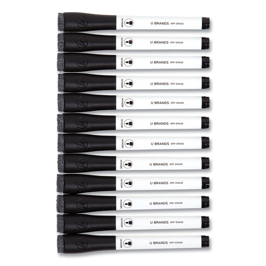 U Brands Medium Point Low-Odor Dry-Erase Markers with Erasers, Medium Bullet Tip, Black, Dozen (2922U0012)