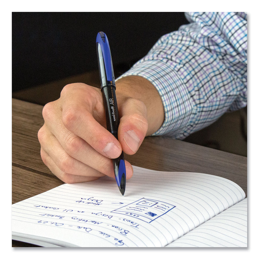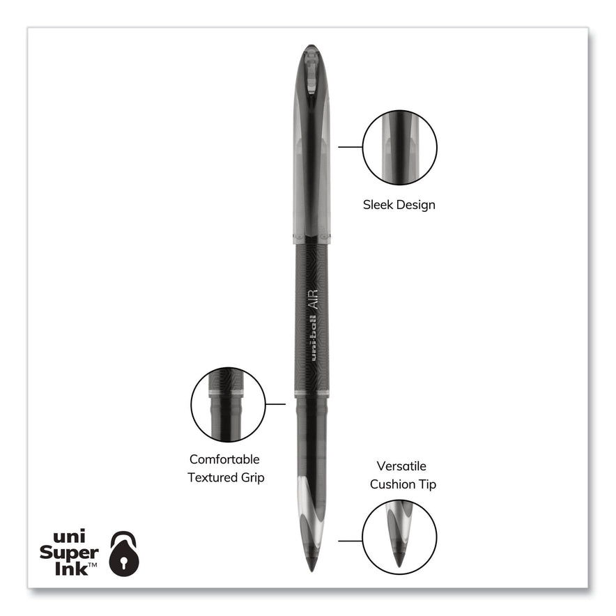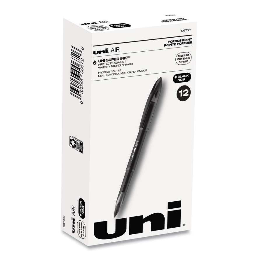 Enjoy a smooth writing experience with AIR Porous Point Rollerball Pens from uni-ball featuring a 0.7 mm medium point. These pens have an innovative sleek tip that writes at any angle while producing crisp, skip-free lines. The porous point rollerball pens adapt to your personal writing grip style, adjusting line widths depending on the pressure of your hand as you write. Combining the fluid ink of a marker with the durability of a rollerball, these pens deliver a smooth writing experience while ensuring your documents are easy to read. Suitable for a variety of writing tasks including journaling, scrapbooking or sketching, these pens glide easily over paper, delivering vibrant marks and lines. uni Super Ink technology ensures the ink adheres strongly to the paper, offering protection from fraud, fading and water. A glass-like plastic clip gives these fine marking pens a stylish look while adding a touch of convenience. Experience effortless writing the moment the pen hits the paper with AIR's versatile cushion tip technology and fluid, free flowing ink. Pen Sub-Brand & Product Family: AIR Porous; Pen Type: Roller Ball Pen; Pen Style: Stick; Pen Tip Type: Conical.