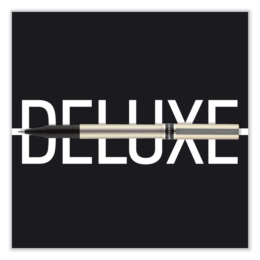 Introduce sophisticated style to your everyday writing with Deluxe Rollerball Stick Pens from uni-ball featuring a strong, long lasting tip. Even-flowing, acid-free liquid ink delivers a smooth writing experience for intense, vibrant lines. Deluxe delivers crisp lines with unparalleled definition, making it easy to create super fine details in your drawings and diagrams. Capped roller pens are useful for a variety of tasks from note taking and list making to signing checks and legal documents. Innovative uni Super Ink technology forms a strong bond with the paper, protecting from water, fading and fraud. Up your writing instrument sophistication with the matte black, brushed steel barrel of the Deluxe capped rollerball pens. Pen Sub-Brand & Product Family: Deluxe; Pen Type: Roller Ball Pen; Pen Style: Stick; Pen Tip Type: Conical.