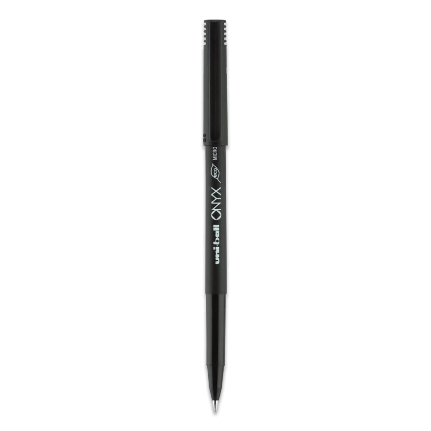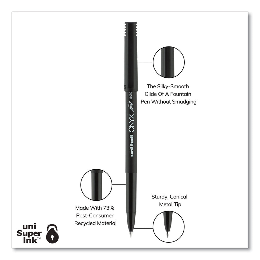 Stock your office, home or classroom with Onyx Rollerball Stick Pens from uni-ball featuring strong, long lasting tip sizes. This rollerball pen delivers the silky-smooth glide of a fountain pen without smudging for effortless writing. ONYX pens produce crisp and precise lines for intricate writing, making it easy to create super fine details in your drawings and diagrams. Capped roller pens are useful for a variety of tasks from note taking to signing checks and legal documents to uniquely embellishing fun and creative writing projects. Innovative uni Super Ink technology forms a strong bond with the paper, protecting from water, fading and fraud. A great economic and environmentally-conscious choice as this super sleek micro point roller pen is made from post-consumer recycled material. Pen Sub-Brand & Product Family: ONYX; Pen Type: Roller Ball Pen; Pen Style: Stick; Pen Tip Type: Conical.