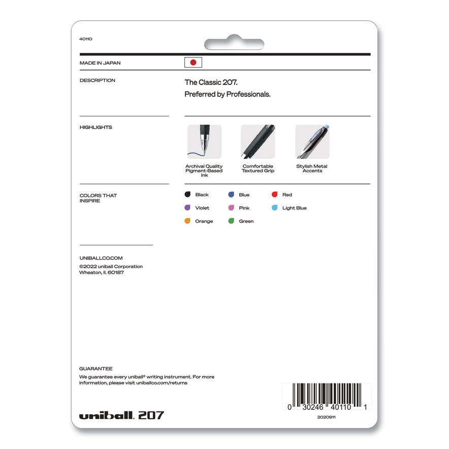 Stock your office, home or classroom with 207 Retractable Gel Pens from uni-ball available in various point sizes with a stainless steel tip that resists bending and breaking. Even-flowing, pigment-based gel ink delivers a smooth writing experience for intense, vibrant lines, ensuring that every mark is brilliantly communicated. Use these retractable gel pens for everyday writing tasks, check signing and all of your important signatures, trusting its quick-drying uni Super Ink. Innovative uni Super Ink technology effectively entraps the gel ink into the paper, producing fraud, fade and water-resistant documents that resist check washing or bleaching. A textured grip offers greater comfort and control as you continue writing, while a translucent ink window indicates the level of gel ink remaining, so you don't run out unexpectedly. The sleek design of the 207 with modern metal accents gives the retractable gel pen a stylish touch. Pen Sub-Brand & Product Family: Signo 207; Pen Type: Gel Pen; Pen Style: Retractable; Pen Tip Type: Conical.