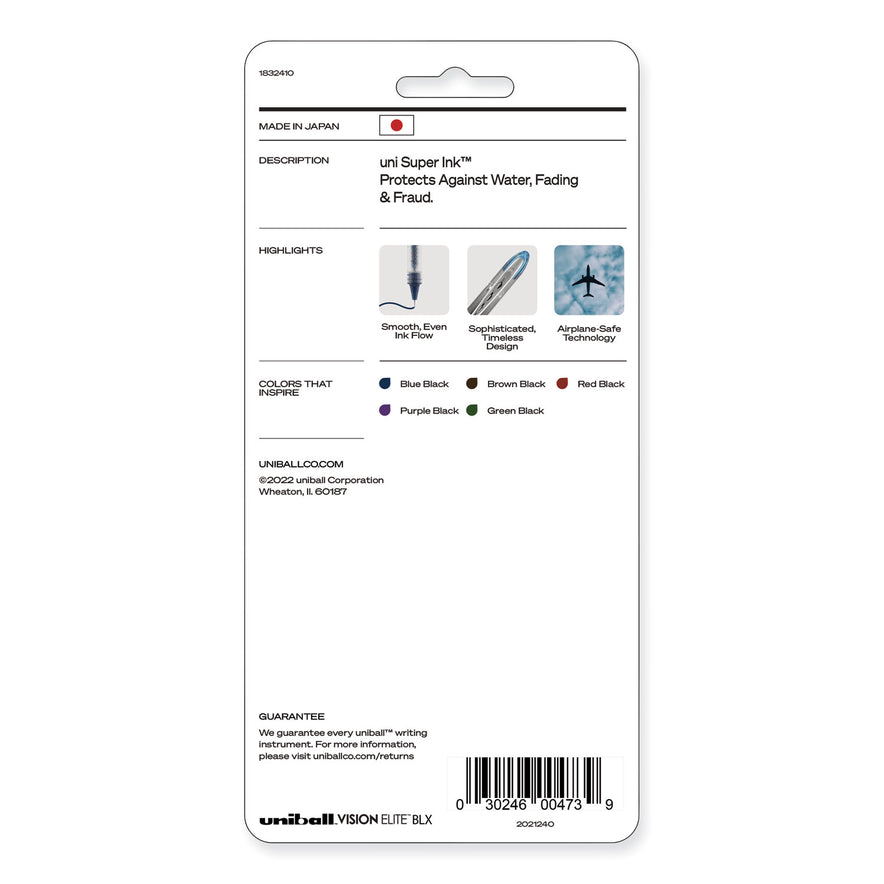 Give your writing a boldly infused flavor with Vision Elite BLX Rollerball Pens from uni-ball featuring a bend-resistant stainless steel tip and tungsten carbide rollerball. Capped roller pens deliver smooth, intense lines with unparalleled definitionuseful for note taking, list making, signing checks and legal documents, and even uniquely embellishing creative writing projects. Innovative uni Super Ink technology effectively entraps the gel ink into the paper, producing fraud, fade and water-resistant documents that resist check washing or bleaching. These Vision Elite pens have a special design that withstands cabin pressure variances without leaking, making them useful for travelers. Exclusive Uni-Flow Ink System ensures a consistent, delightfully fluid writing experience, and a translucent window ensures that you don't run out of ink unexpectedly. These sleek and modern roller pens come in an assortment of black ink infused colors, adding an element of drama to your every day tasks and creative writing projects no matter the altitude. Pen Sub-Brand & Product Family: VISION ELITE BLX Series; Pen Type: Hybrid Gel Pen; Pen Style: Stick; Pen Tip Type: Conical.