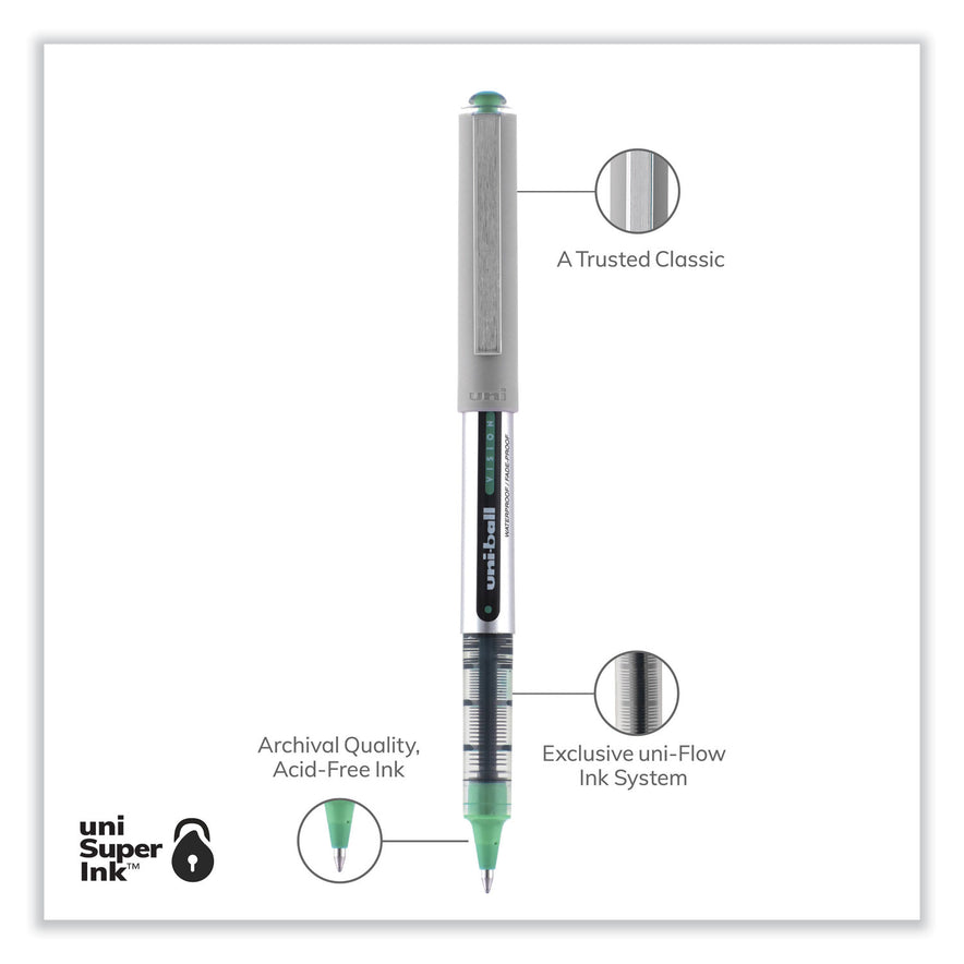 Make your everyday writing easy with the effortless and dependable performance of Vision Rollerball Pens from uni-ball featuring strong, long lasting tips. Capped roller pens deliver an even liquid ink lay-down for reliably smooth, vivid lines and a rich color for improved clarity and readability. Great for all writing tasks from taking notes to record keeping with archival quality, acid free roller ink. Innovative uni Super Ink technology forms an indestructible bond with the paper to minimize the risk of check washing or document fraud, while also protecting from water and fading. The exclusive Uni-Flow Ink System ensures a consistent, delightfully fluid writing experience, and a translucent window ensures that you don't run out of ink unexpectedly. Enjoy beautiful clean lines and give all of your ideas a burst of brilliant color with this classic style rollerball pen. Pen Sub-Brand & Product Family: VISION; Pen Type: Roller Ball Pen; Pen Style: Stick; Pen Tip Type: Conical.