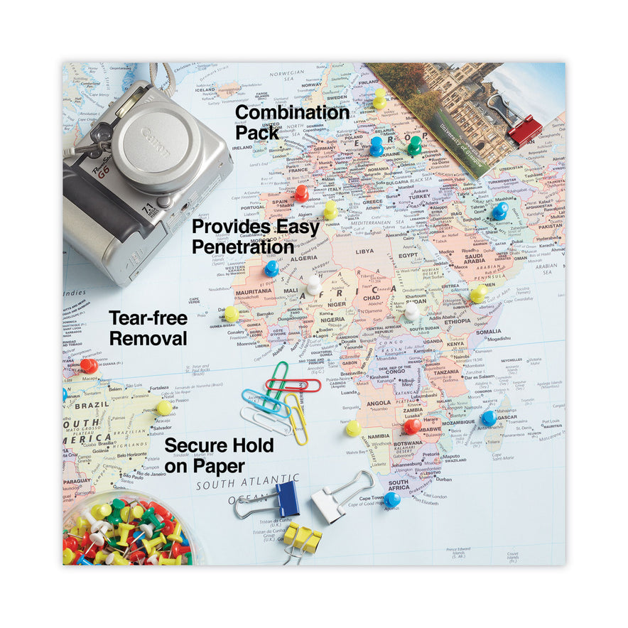 Includes 46 binder clips, 280 push pins, and 380 plastic-coated paper clips.
