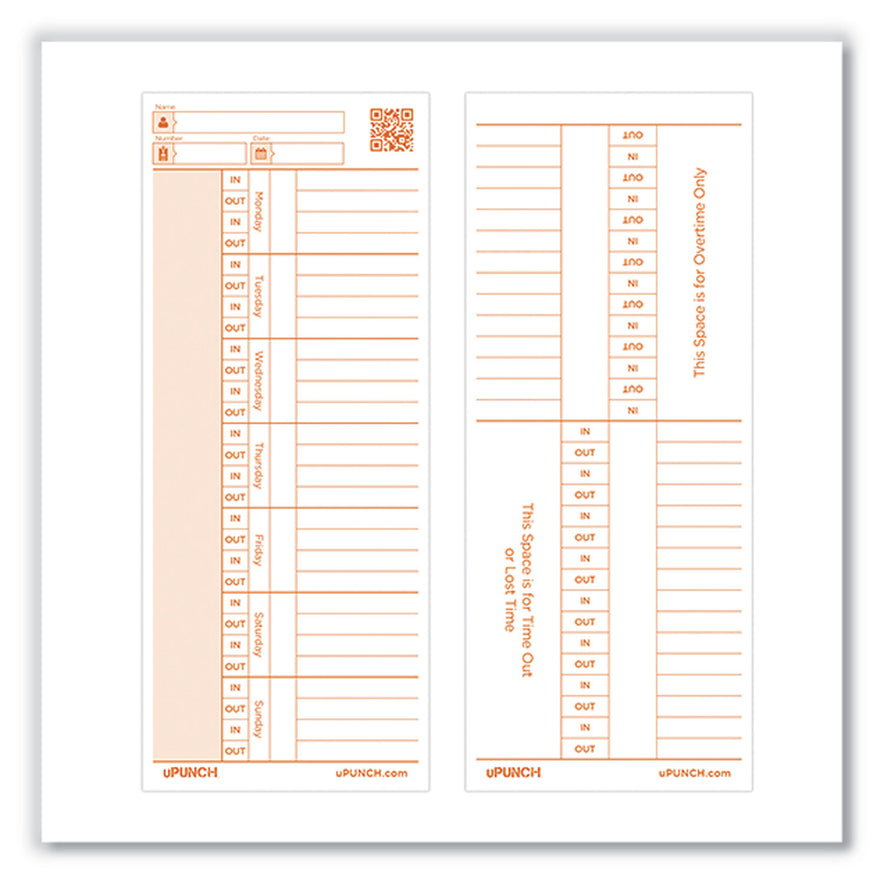 Easily track time with the high-quality uPunch double-sided time card. Designed to work seamlessly with your PK1100 electronic auto-align punch time clock, this time card features up to four punches per day for in/out, breaks, and lunches. All sections are clearly defined, including added space for notes and approvals, giving you everything you need to easily and efficiently track time and attendance. Size: 3.38 x 8.25; Time Period: Weekly; Printing Sides: Two Sides; Card Quantity: 100.