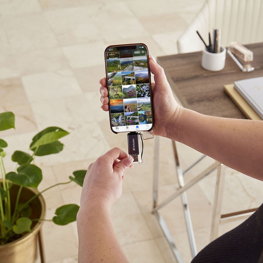 Store 'n' Go Dual™ USB 3.2 Gen 1 Flash Drive for Apple Lightning Devices With the free Verbatim Store 'n' Go app, available on the app store, the Store 'n' Go Dual USB drive allows you to transfer files between your Apple device and USB-A equipped PC or device. Delivering dependable storage with two different USB connector types, Dual USB drives simplify file transferring between devices. Free up storage space on your mobile devices by directly saving your documents and media files to a Dual USB drive. With plug-and-play functionality, easily backup your files across multiple devices and quickly share with peers. *Apple device must be equipped with an Apple Lightning port. See list below. **Available for download from App Store