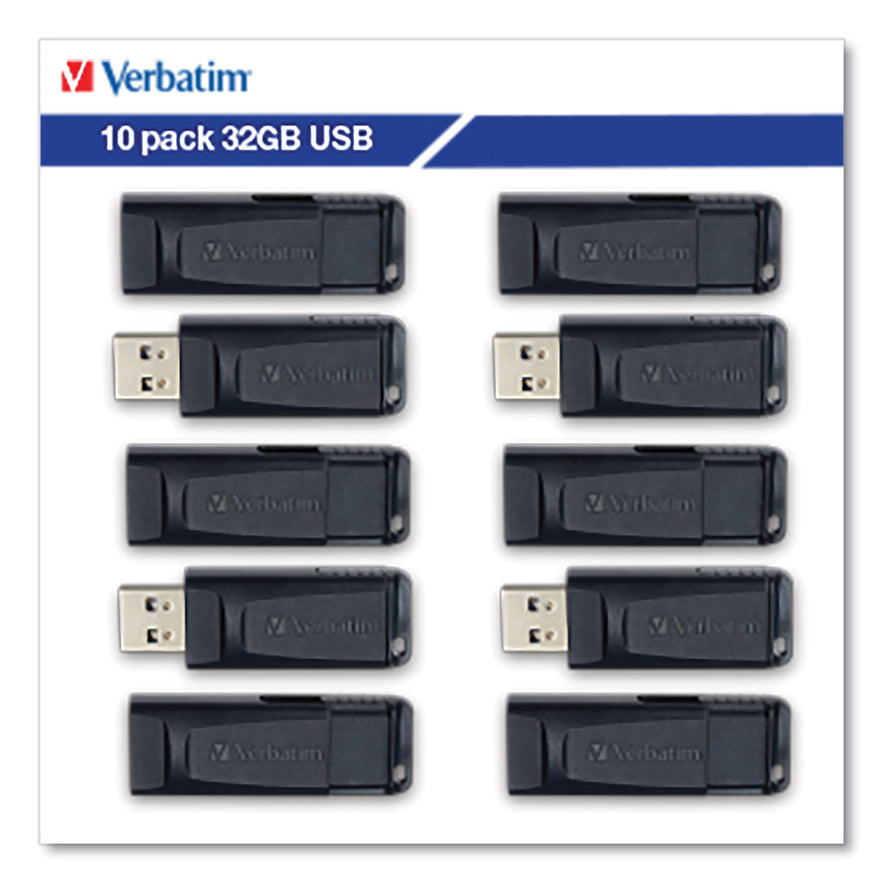 Trust your files to a Verbatimclassic! Store your data quickly and easily with Verbatim Store n' Go USB drives. With a reliable name you've come to trust, these drives let you take your data anywhere and everywhere. The convenient cap-less design with retractable housing protects the USB connector and easily slides in and out. These Verbatim USB drives include built-in Microban antimicrobial product protection. This antimicrobial technology helps prevent the growth of bacteria, keeping your USB drives cleaner. 10 per Pack. Connector/Port/Interface: USB 2.0; Storage Capacity: 32 GB; Weight: 0.32 oz; Operating System Compatibility: Linux: 2.6 and Later; Mac OS X 10.1 and Later; Windows 7 and Later.
