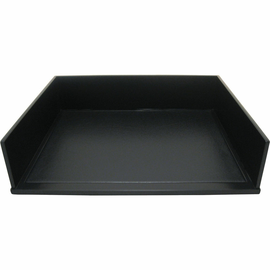 Stacking letter tray is part of the Victor Midnight Black Collection that combines functional solutions with appealing design elements. Side-loading, letter-size desk tray is large enough for papers, folders and notebooks. Stackable design allows letter trays to nest securely on top of one another for solid stacking up to five high. Sturdy, 2.4 lb. wood construction is double-coated with a matte black finish for durability. Faux-leather top adds a touch of class. Nonslip rubber feet reduce movement and protect your worksurface from scratches and scuffs. Stylish design with crown molding base makes a great addition to any desk. More from the Manufacturer