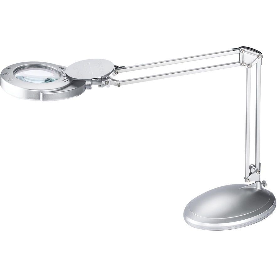 Illuminate any project with this LED Magnifying Lamp with a silver finish. Interchangeable base converts between standing desktop and clamp-on for optimal lighting in various settings. Adjustable arm directs light where you need it most. Powerful, three-diopter lens enlarges items by 175 percent, making this lamp ideal for close-up work, such as sewing and crafting. This lamp is equipped with a built-in, 400-lumen, 4.6 watt, pre-wired LED bulb that has an average rated life of 30,000 usage hours.