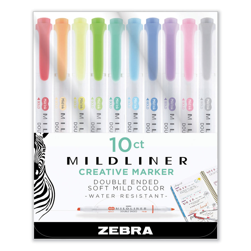 Zebra Mildliner Double Ended Highlighter, Assorted Ink Colors, Bold-Chisel/Fine-Bullet Tips, Assorted Barrel Colors, 10/Set (78101)